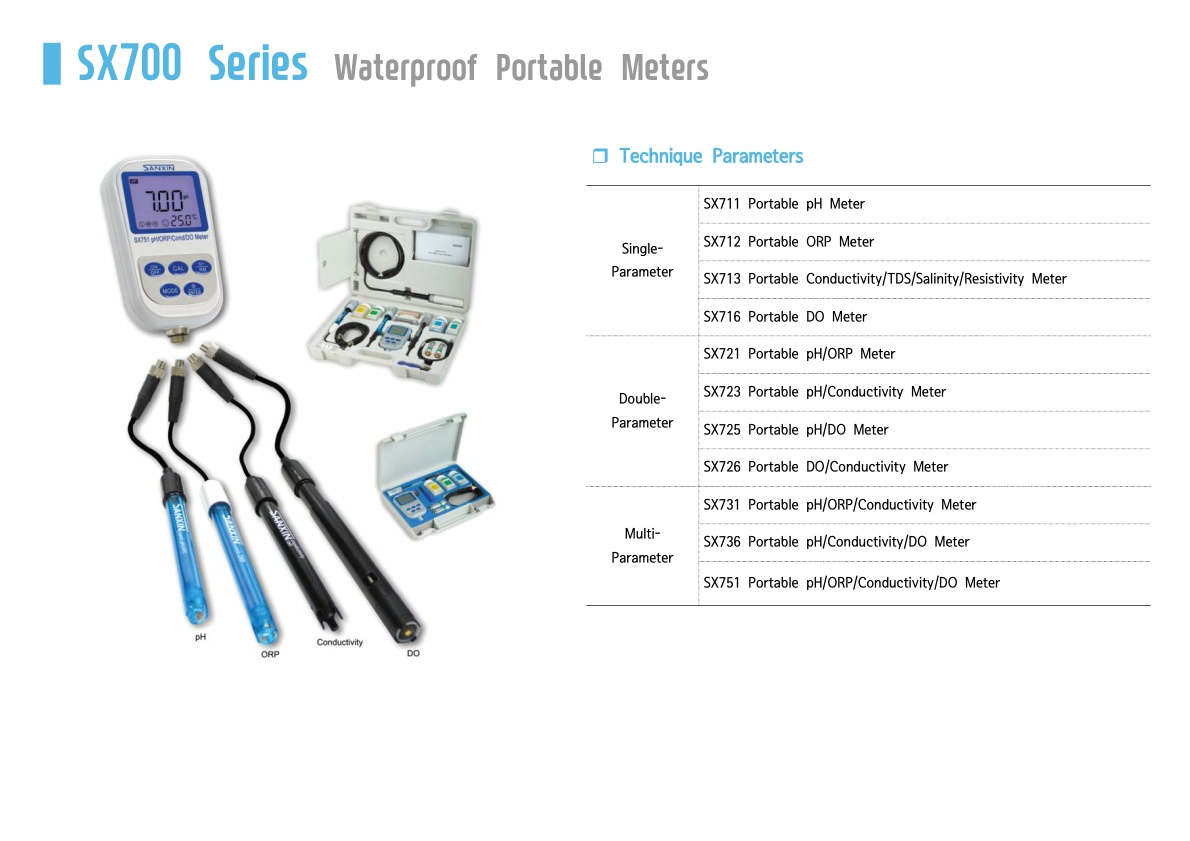 Model : SX731 Meas. ITEM : pH/ORP/Conductivity Power : AA batteries*2 (1.5V*2) LCD Display : 42*43mm, Blue backlight IP Class : IP57 Dimension : 65*120*31mm Weight : 180g